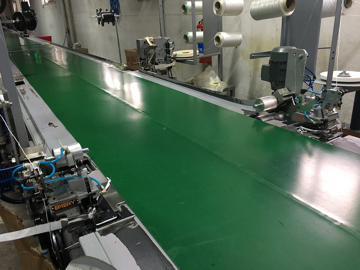 This machine is used for sewing two short sides of weaved carpet after overlock process, in addition there is PLC control system..